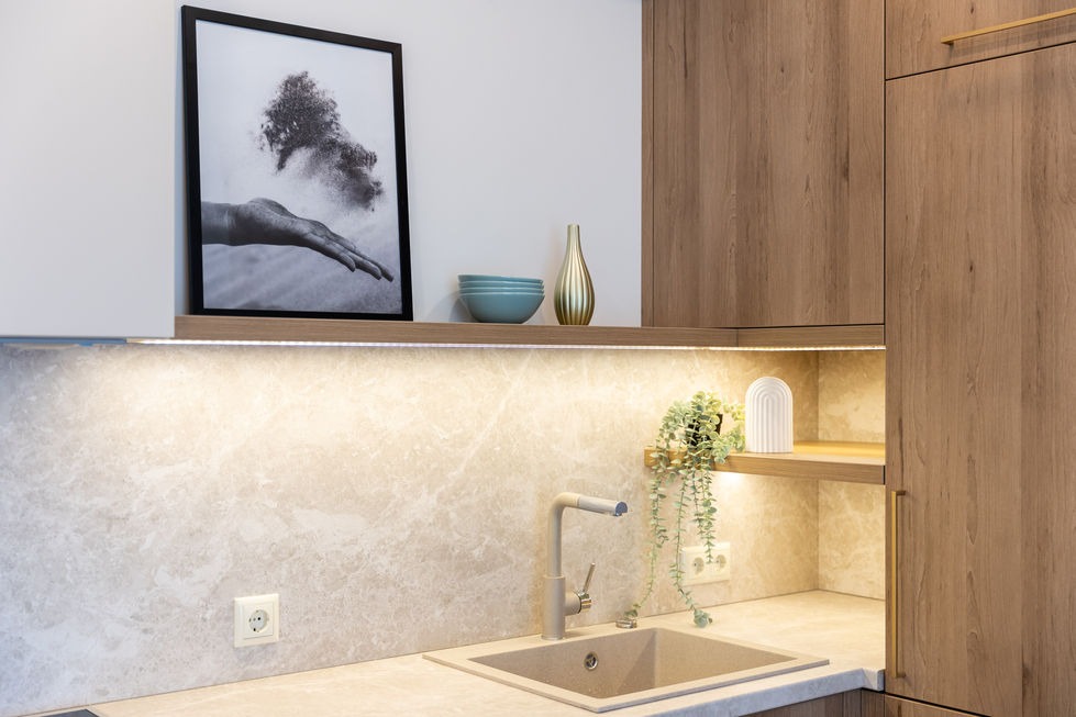 Nedidelė virtuvė ir svetainė – tarsi namų centras. Ši erdvė funkcionali, bet nesubuitinta. Netikėtas metalizuoto cokolio sprendimas virtuvės baldui suteikia dar daugiau lengvumo ir modernumo.