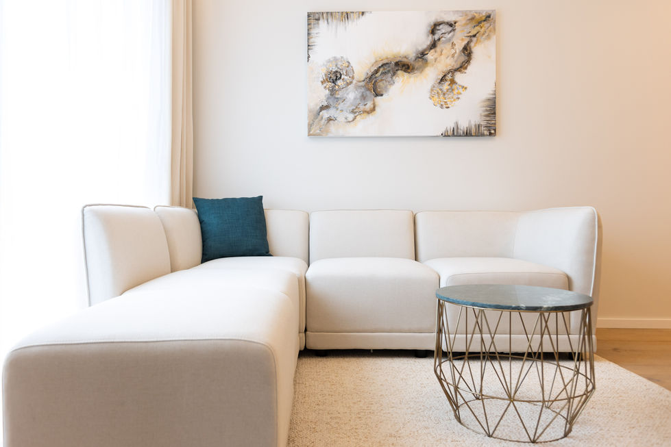 Interjero funkciniai sprendimai bei erdvių išdėstymas kurti, siekiant maksimaliai išpildyti užsakovo lūkesčius, kurie atspindėtų nedidelės šeimos gyvenimo būdą. Koreguotos vidinės buto pertvaros, įrengta erdvi drabužinė, pakeista virtuvės vieta. Kadangi statytojo numatyto miegamojo langai išeina į judrią gatvę, pasiūlyta miegamojo ir darbo kambarius sukeisti vietomis. Taip miegamasis tampa jaukiu poilsio kambariu su tiesioginiu išėjimu į terasą.